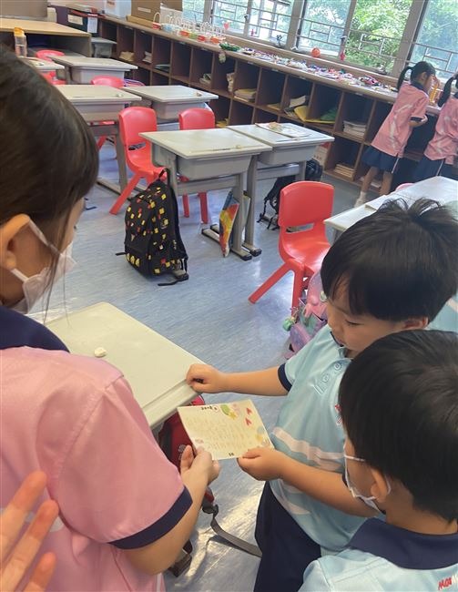 愛心大使化身為打氣小天使,在評估前為部分小一同學送上親手製作的心意卡,為小一同學打氣。