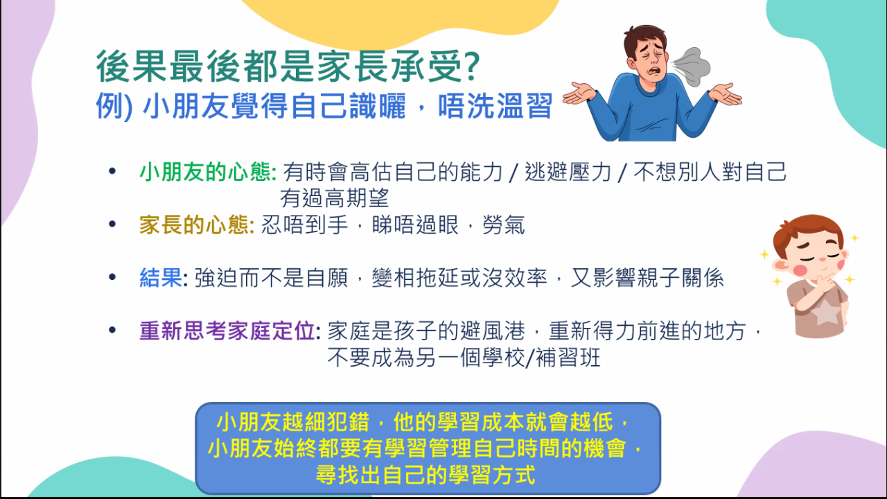 2026-02-05 有關這個活動:本校透過舉辦家長講座,協助家長有效地回應子女在成長中可能出現的挑戰言語及行為,並引導他們建立自律守規的習慣。活動負責老師:香港小童群益會家庭生活教育主任蔡姑娘(註冊社工)、何斯翹姑娘活動日期:2026年01月17日地點:ZOOM