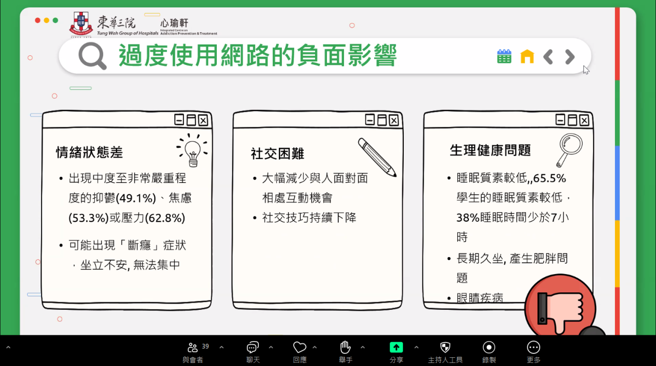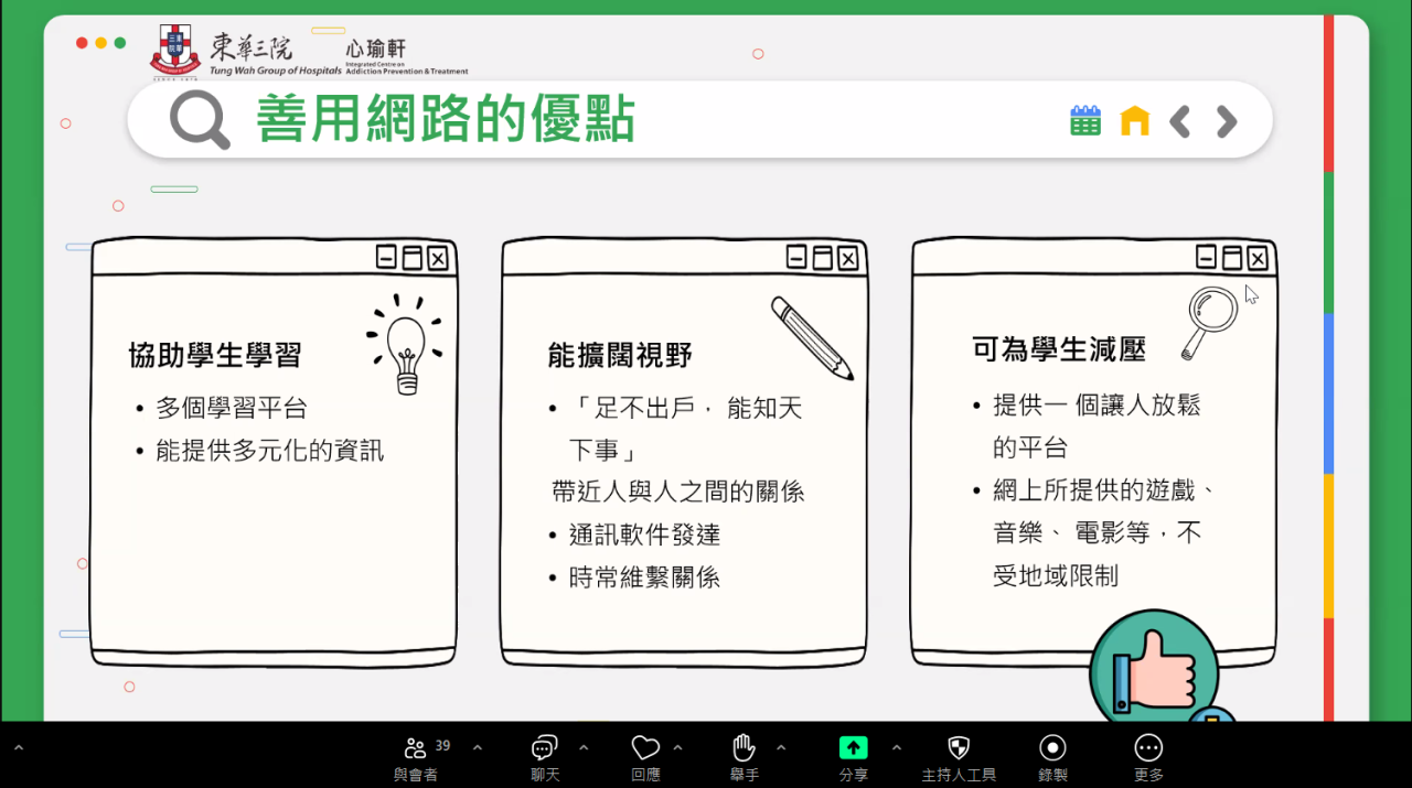 2026-02-26 有關這個活動:本校透過舉辦家長講座,讓家長了解孩子對電子產品的需要,並學習有效管教子女恰當地使用電子產品的方法。活動負責老師:東華三院「e世代健康支援網絡」社工陸姑娘、何斯翹姑娘活動日期:2026年2月7日地點:ZOOM