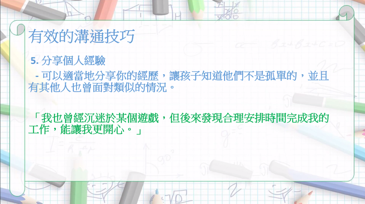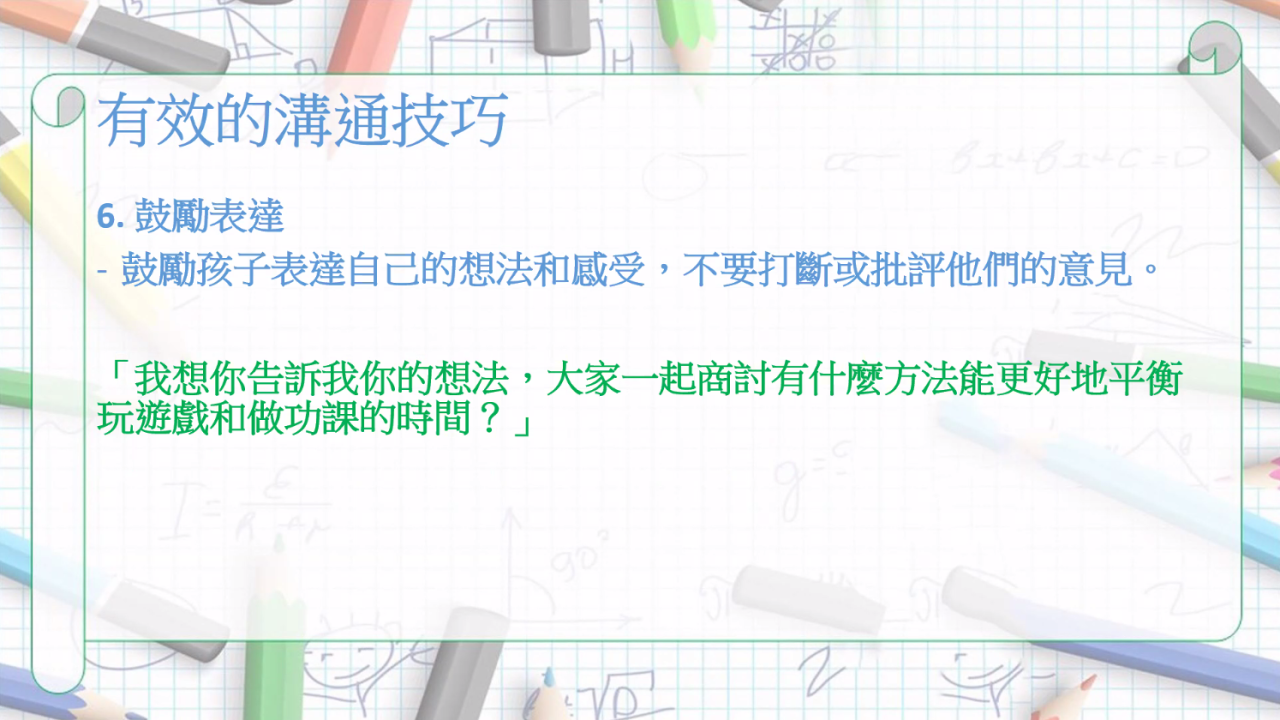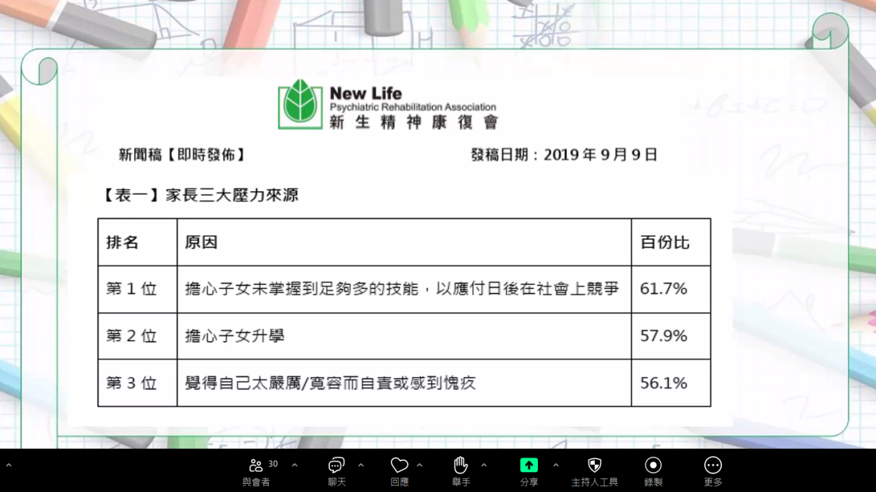 2025-11-04 有關這個活動:本校透過舉辦家長講座,協助家長理解子女的壓力來源、辨識常見的溝通障礙,並學習有效的親子溝通技巧,從而能更適切地向孩子表達支持與關心。活動負責老師:香港聖公會馬鞍山(南)青少年綜合服務中心社工、何斯翹姑娘活動日期:2025年10月18日地點:ZOOM