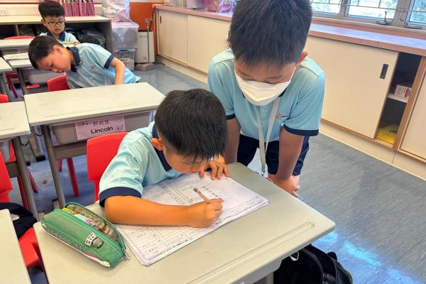 愛心大使透過教導小一同學寫家課冊,學習關愛別人的技巧。