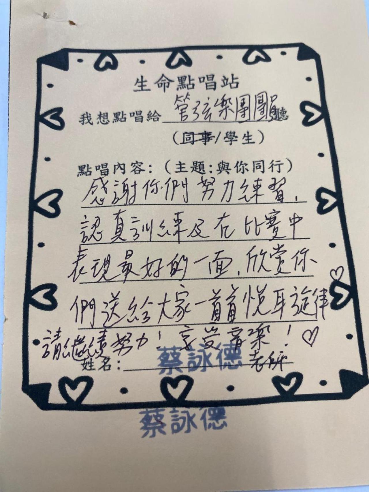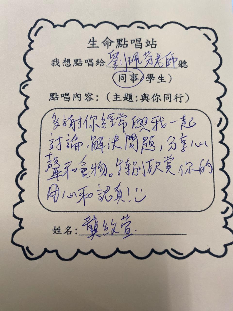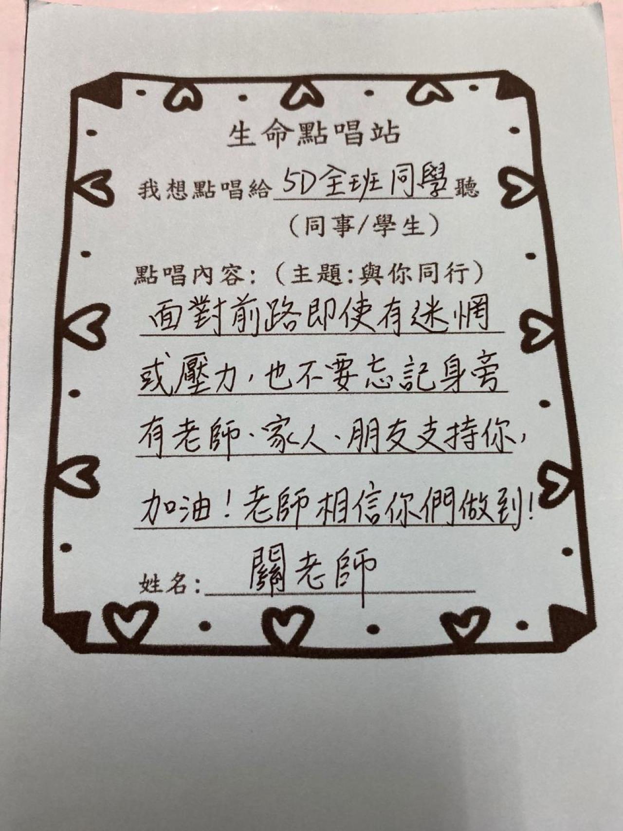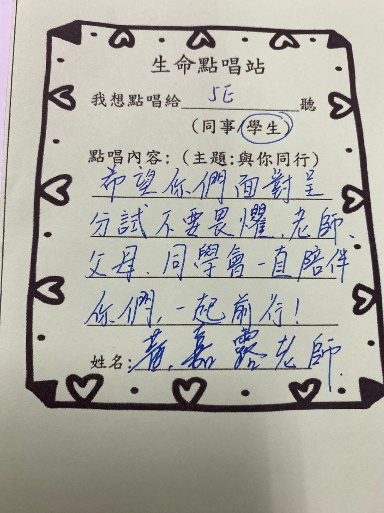 教師們透過點唱《陪着你走》互相鼓勵,也為學生打氣。