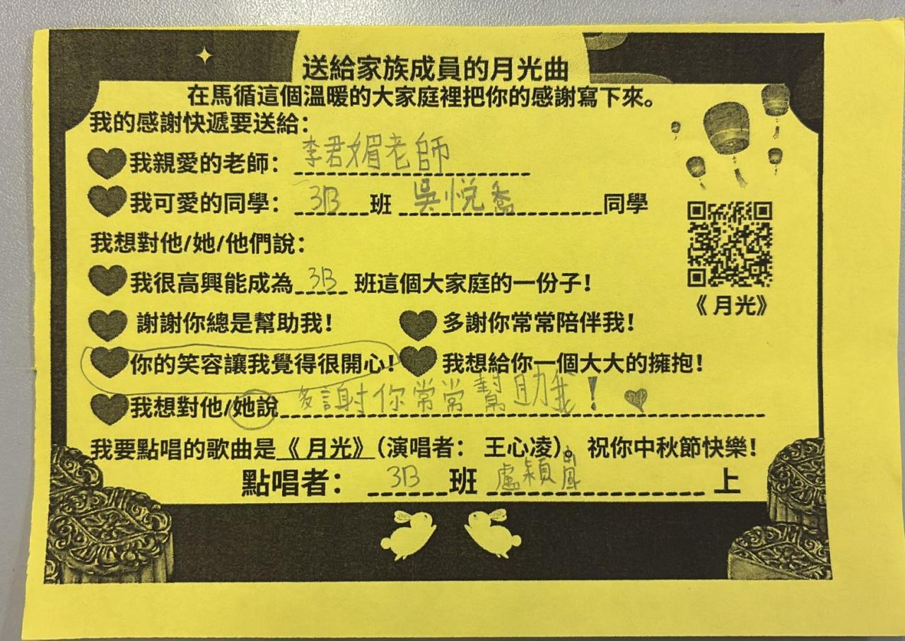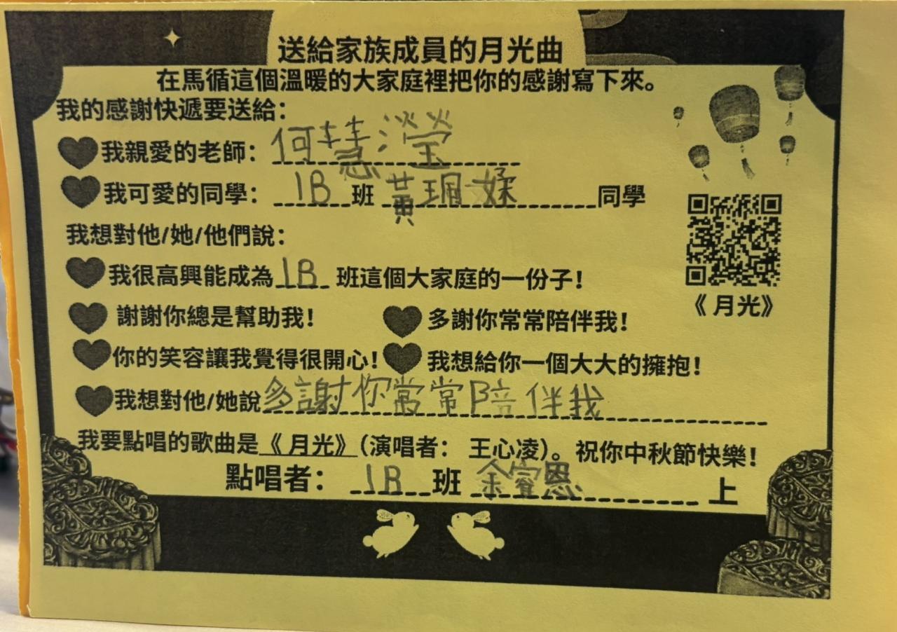 2025-10-08 1B25余睿恩 2D12江天頤 3B17盧穎嵐 4D06莊惠貽 4D11洪梓涵 5B13許熙兒 5E05馮鍵昕 5E09劉芷希 6A23黃梓心 6D04錢之夏 6D09林奕霏 作品描述:同學透過生命教育科活動-生命點唱站,藉着中秋佳節,以點唱紙的方式,表達對老師和同學的感激與陪伴。這不僅增強了同學之間的聯繫,也讓大家更加珍惜彼此的存在。