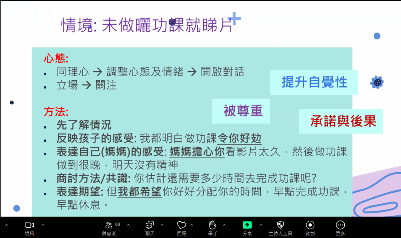 2026-02-05 有關這個活動:本校透過舉辦家長講座,協助家長有效地回應子女在成長中可能出現的挑戰言語及行為,並引導他們建立自律守規的習慣。活動負責老師:香港小童群益會家庭生活教育主任蔡姑娘(註冊社工)、何斯翹姑娘活動日期:2026年01月17日地點:ZOOM