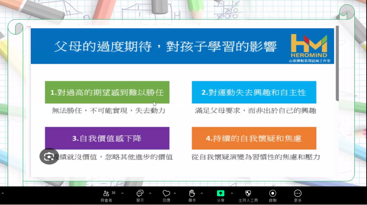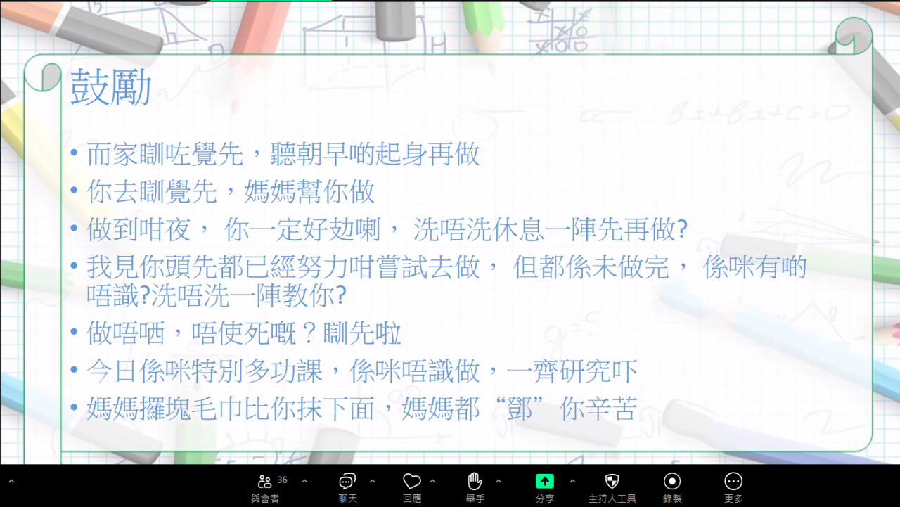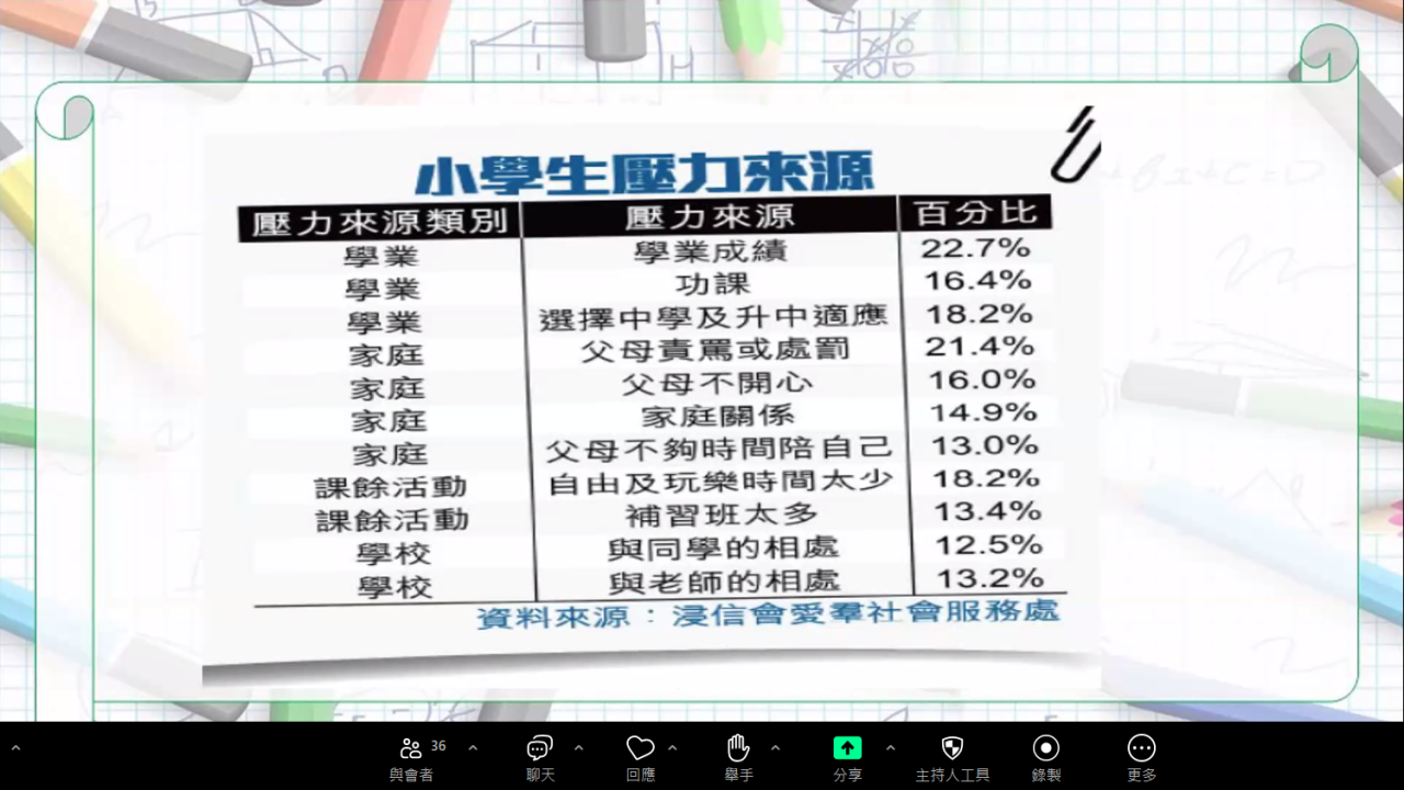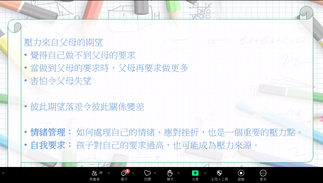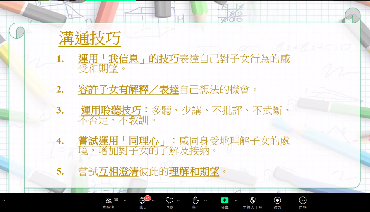 2025-11-04 有關這個活動:本校透過舉辦家長講座,協助家長理解子女的壓力來源、辨識常見的溝通障礙,並學習有效的親子溝通技巧,從而能更適切地向孩子表達支持與關心。活動負責老師:香港聖公會馬鞍山(南)青少年綜合服務中心社工、何斯翹姑娘活動日期:2025年10月18日地點:ZOOM