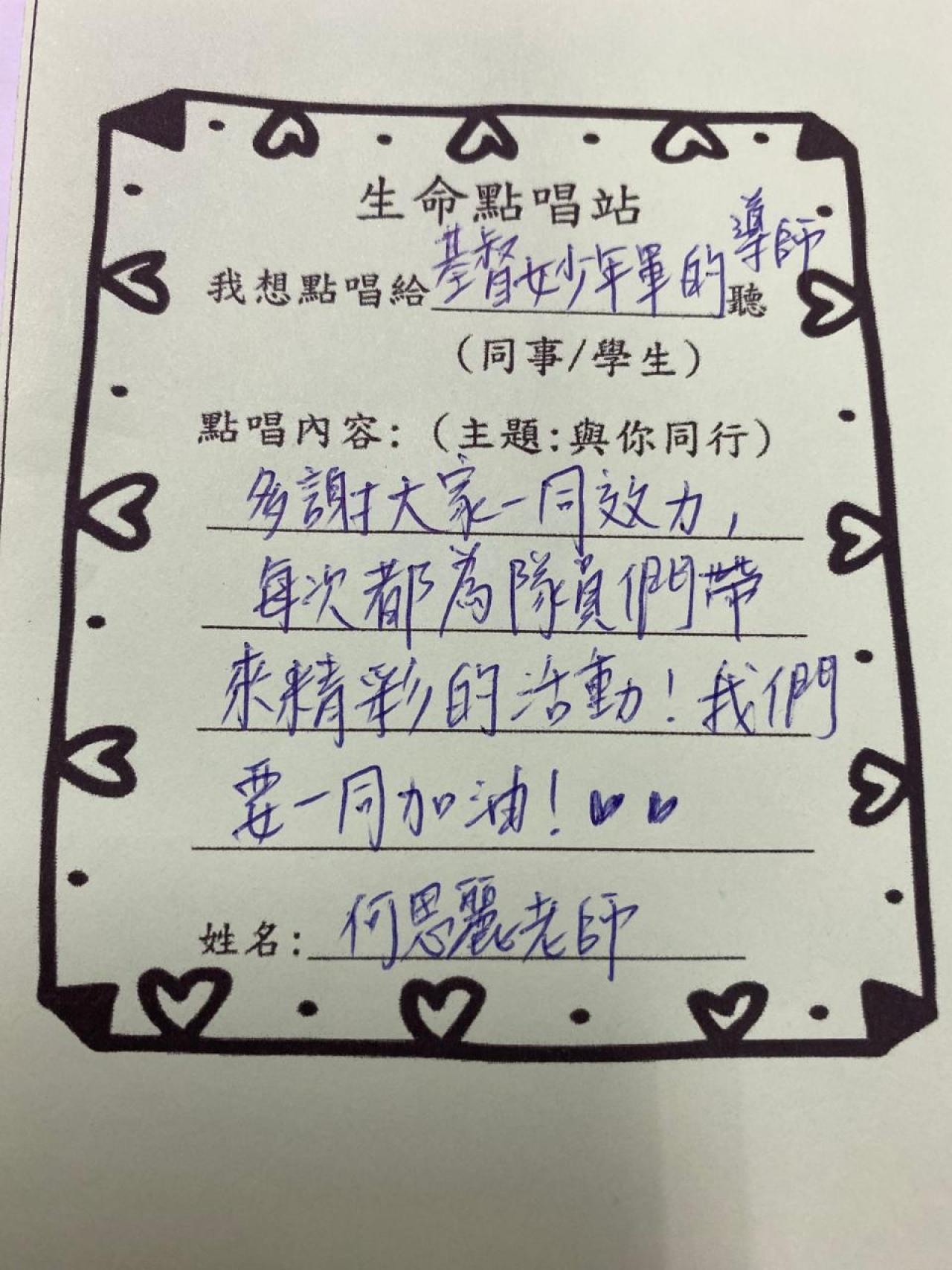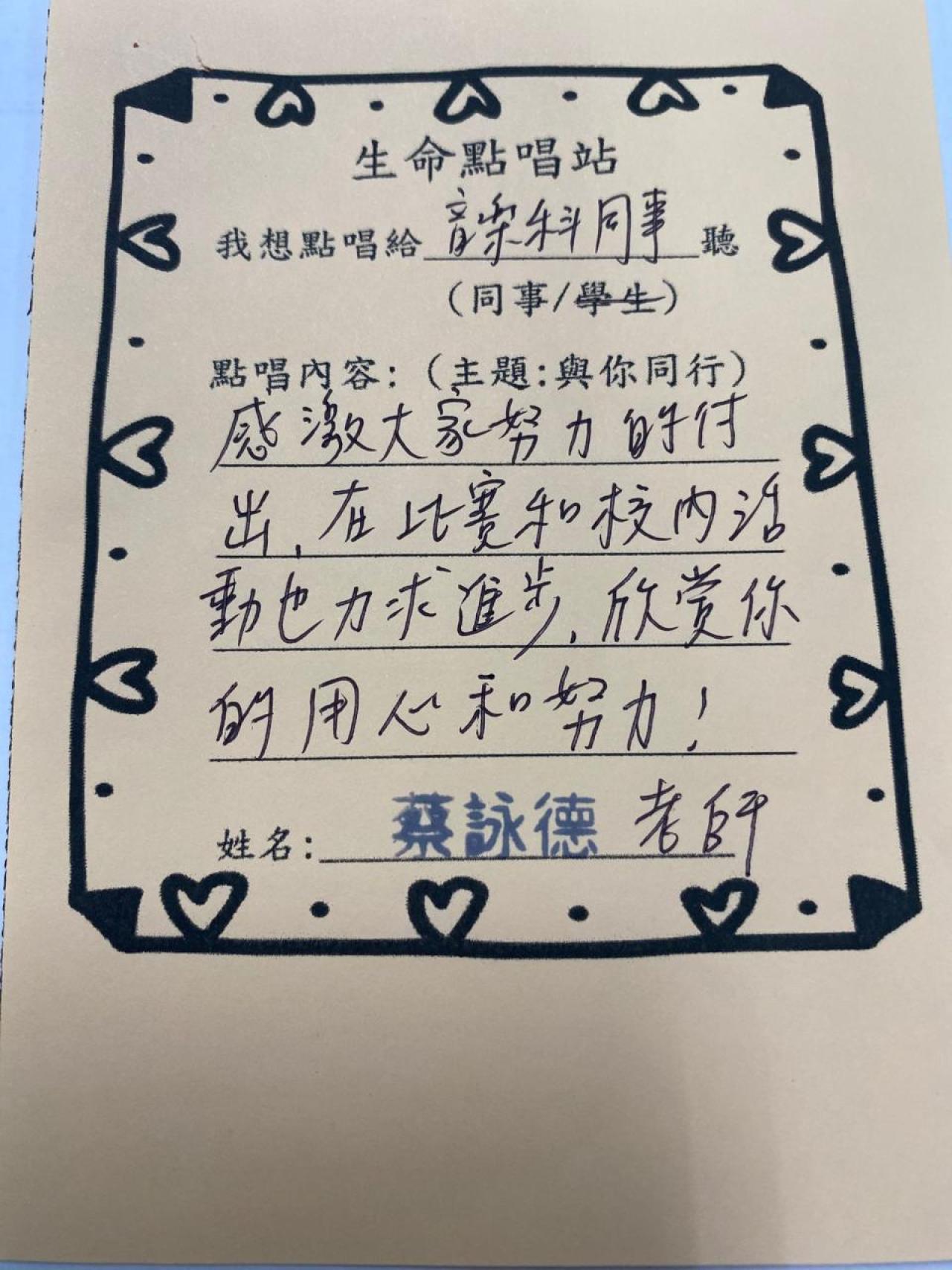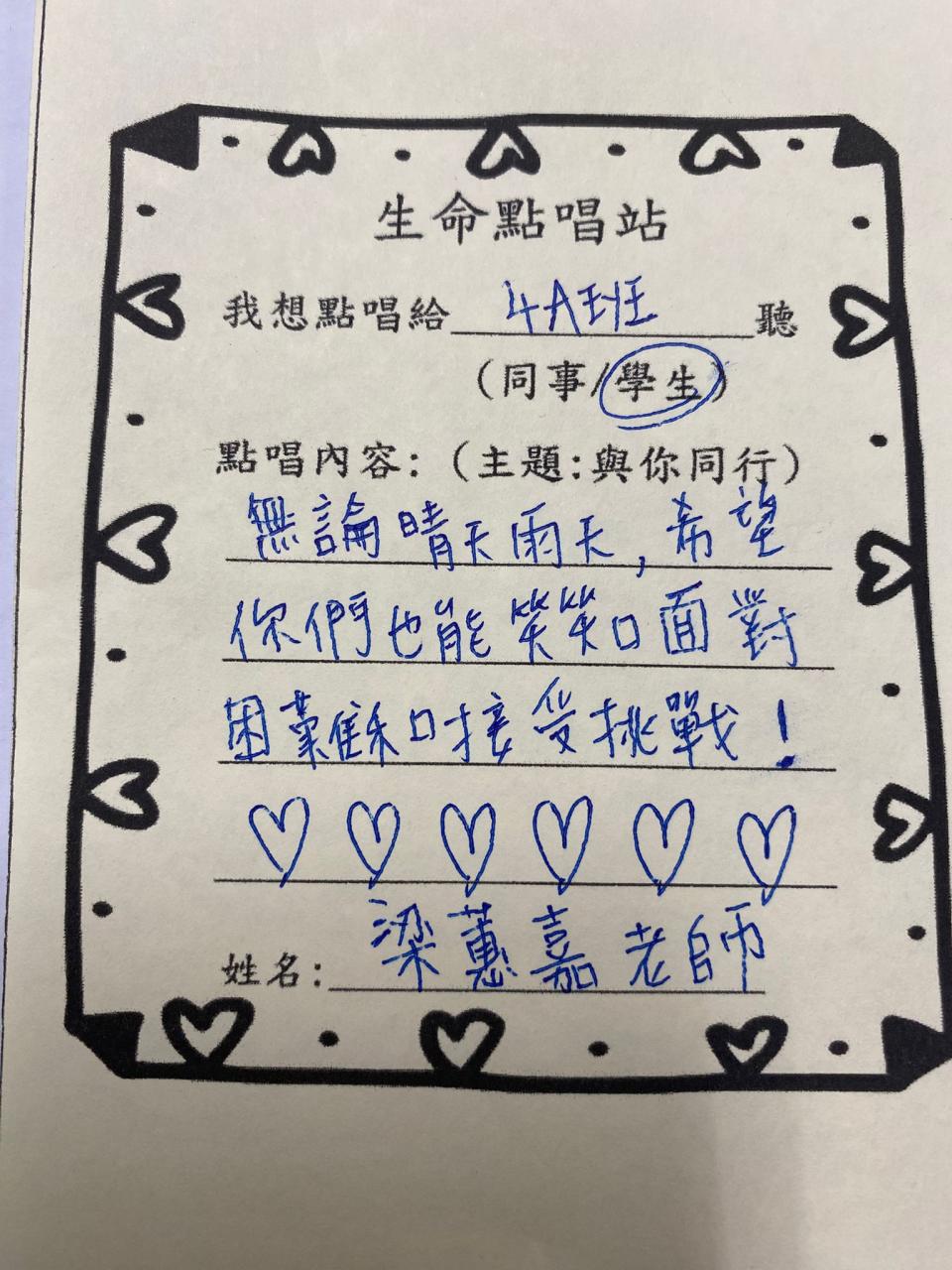 教師們透過點唱《陪着你走》互相鼓勵,也為學生打氣。
