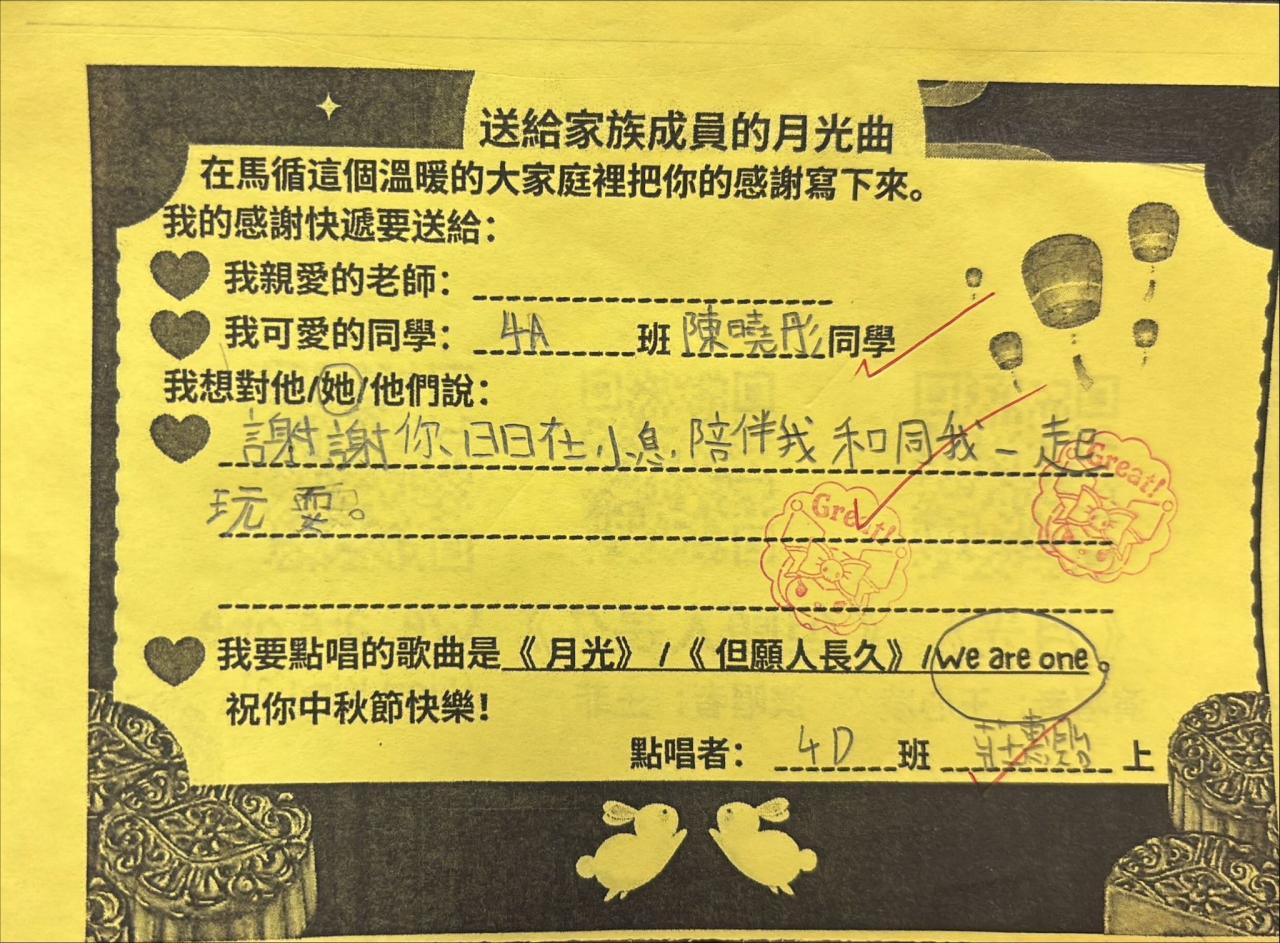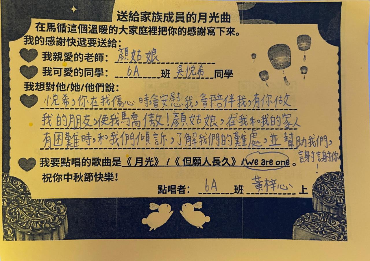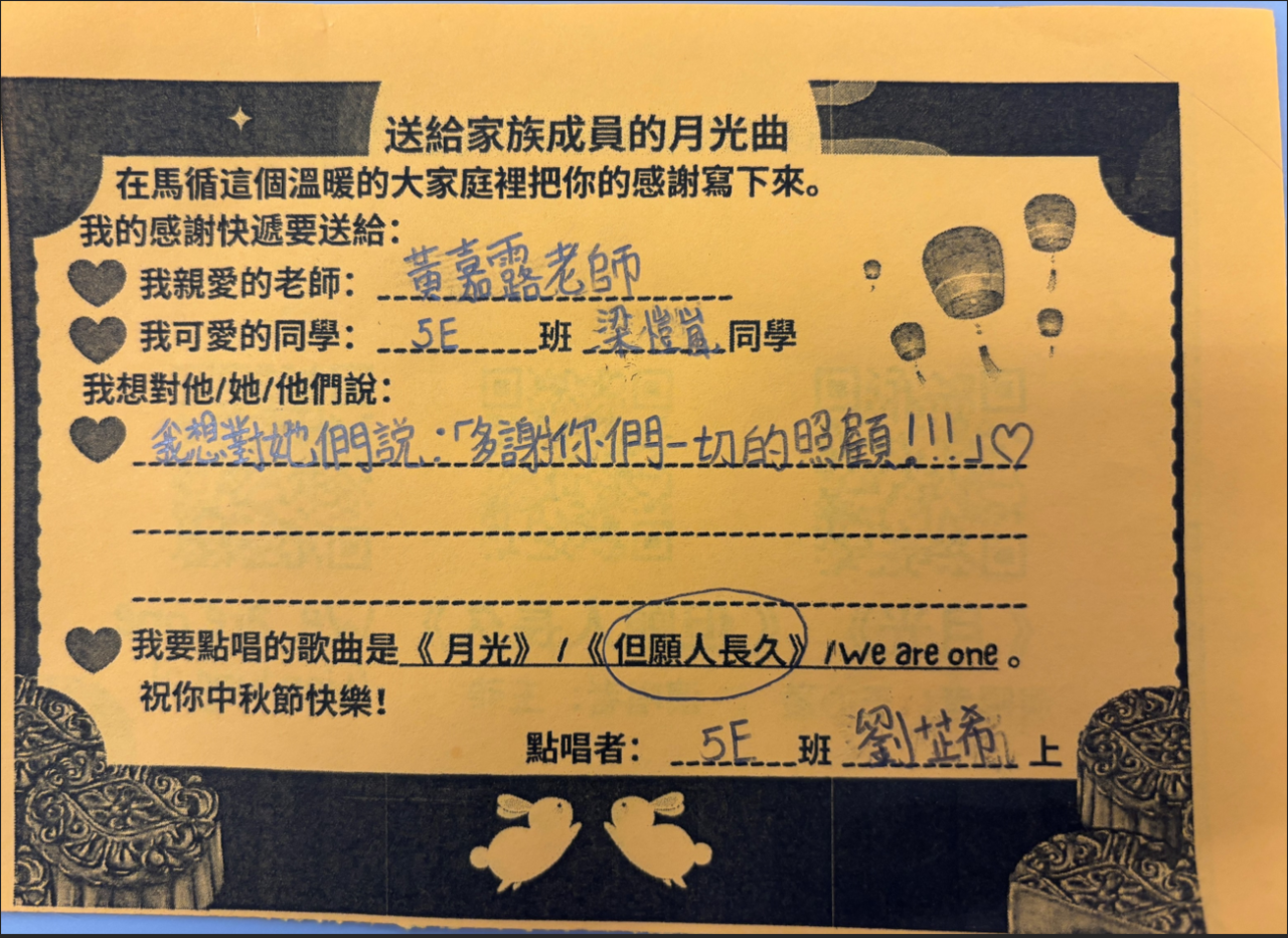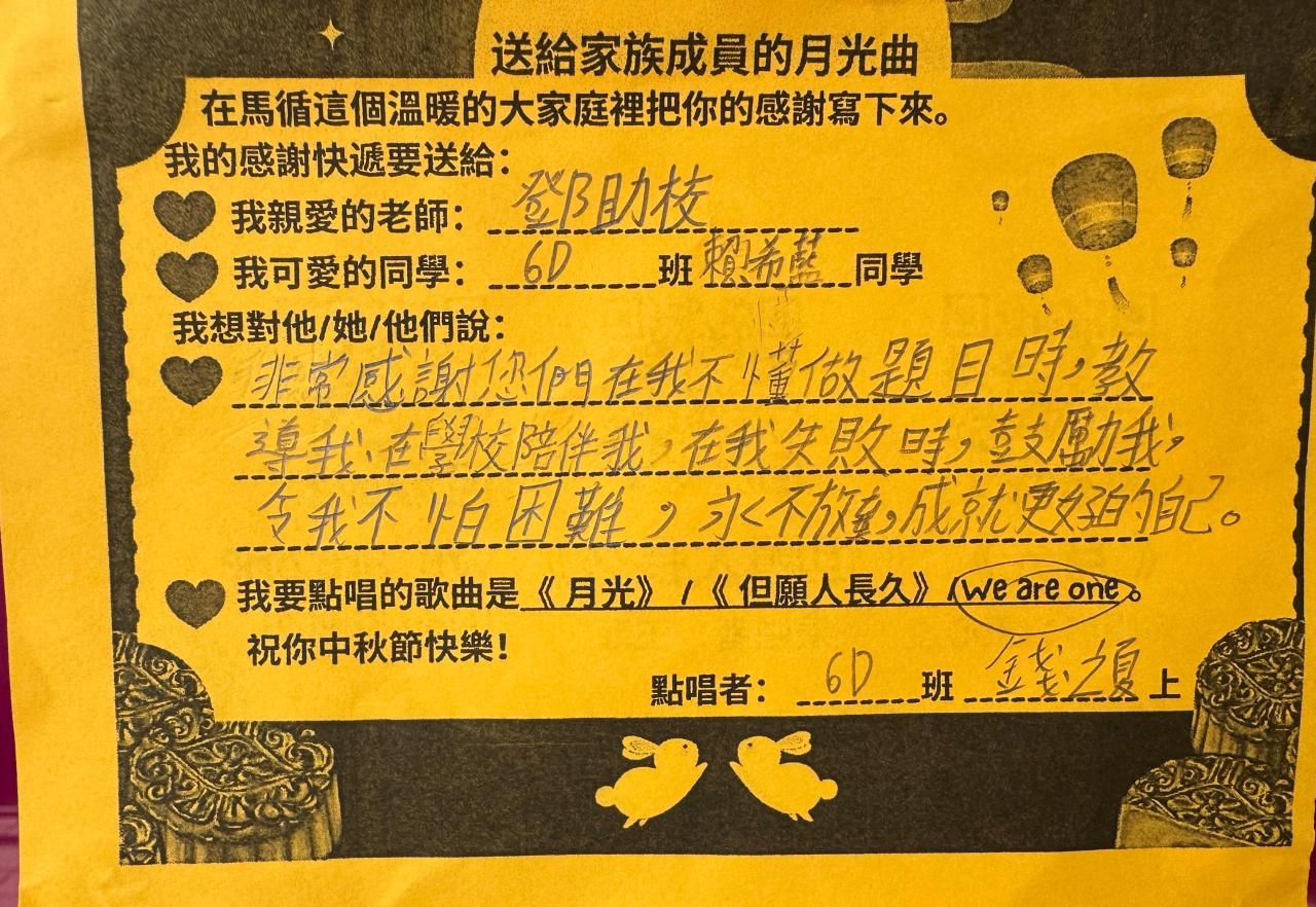 2025-10-08 1B25余睿恩 2D12江天頤 3B17盧穎嵐 4D06莊惠貽 4D11洪梓涵 5B13許熙兒 5E05馮鍵昕 5E09劉芷希 6A23黃梓心 6D04錢之夏 6D09林奕霏 作品描述:同學透過生命教育科活動-生命點唱站,藉着中秋佳節,以點唱紙的方式,表達對老師和同學的感激與陪伴。這不僅增強了同學之間的聯繫,也讓大家更加珍惜彼此的存在。