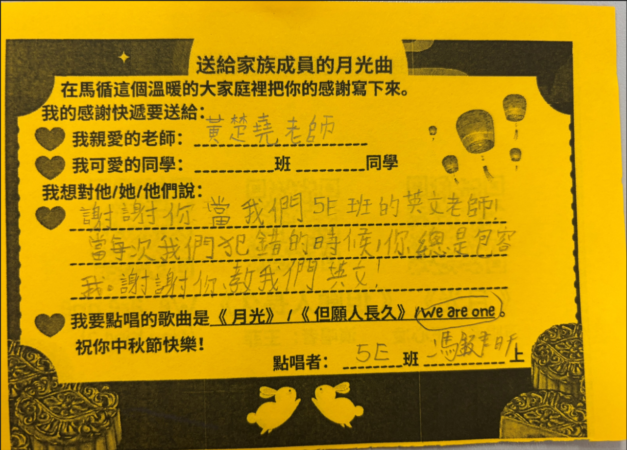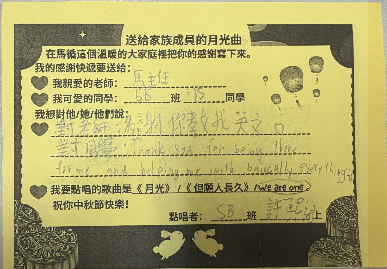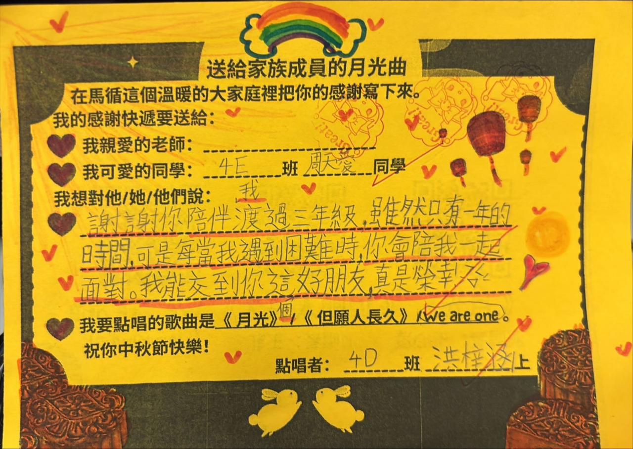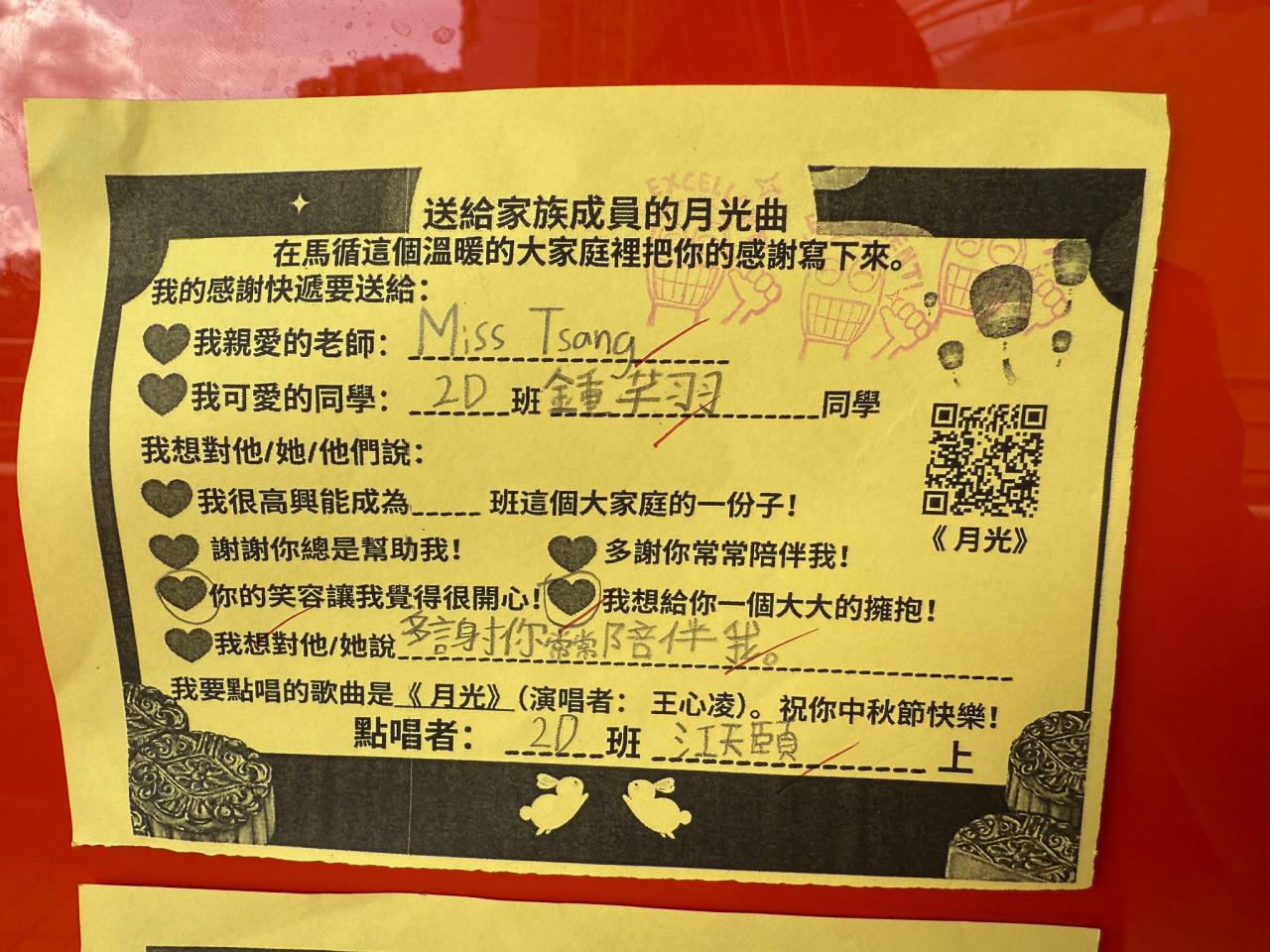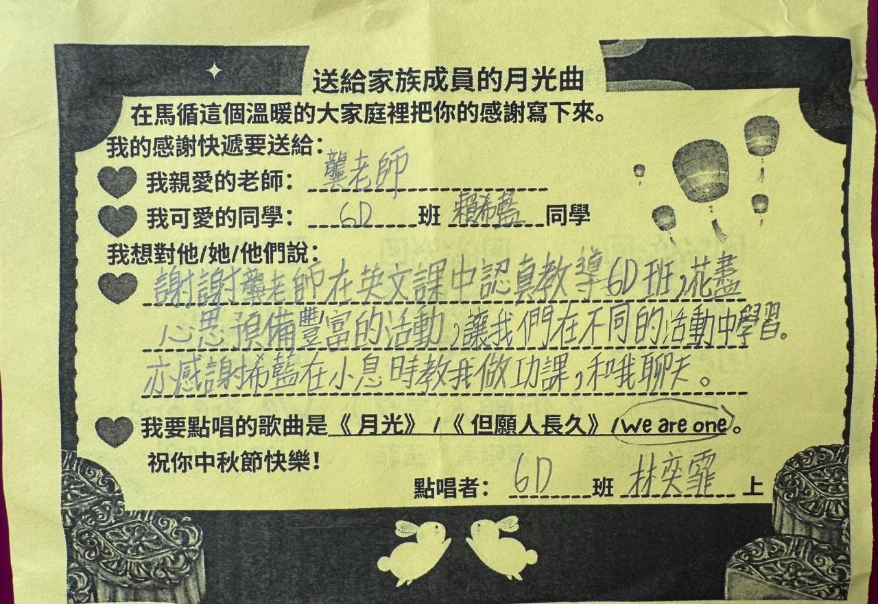 2025-10-08 1B25余睿恩 2D12江天頤 3B17盧穎嵐 4D06莊惠貽 4D11洪梓涵 5B13許熙兒 5E05馮鍵昕 5E09劉芷希 6A23黃梓心 6D04錢之夏 6D09林奕霏 作品描述:同學透過生命教育科活動-生命點唱站,藉着中秋佳節,以點唱紙的方式,表達對老師和同學的感激與陪伴。這不僅增強了同學之間的聯繫,也讓大家更加珍惜彼此的存在。