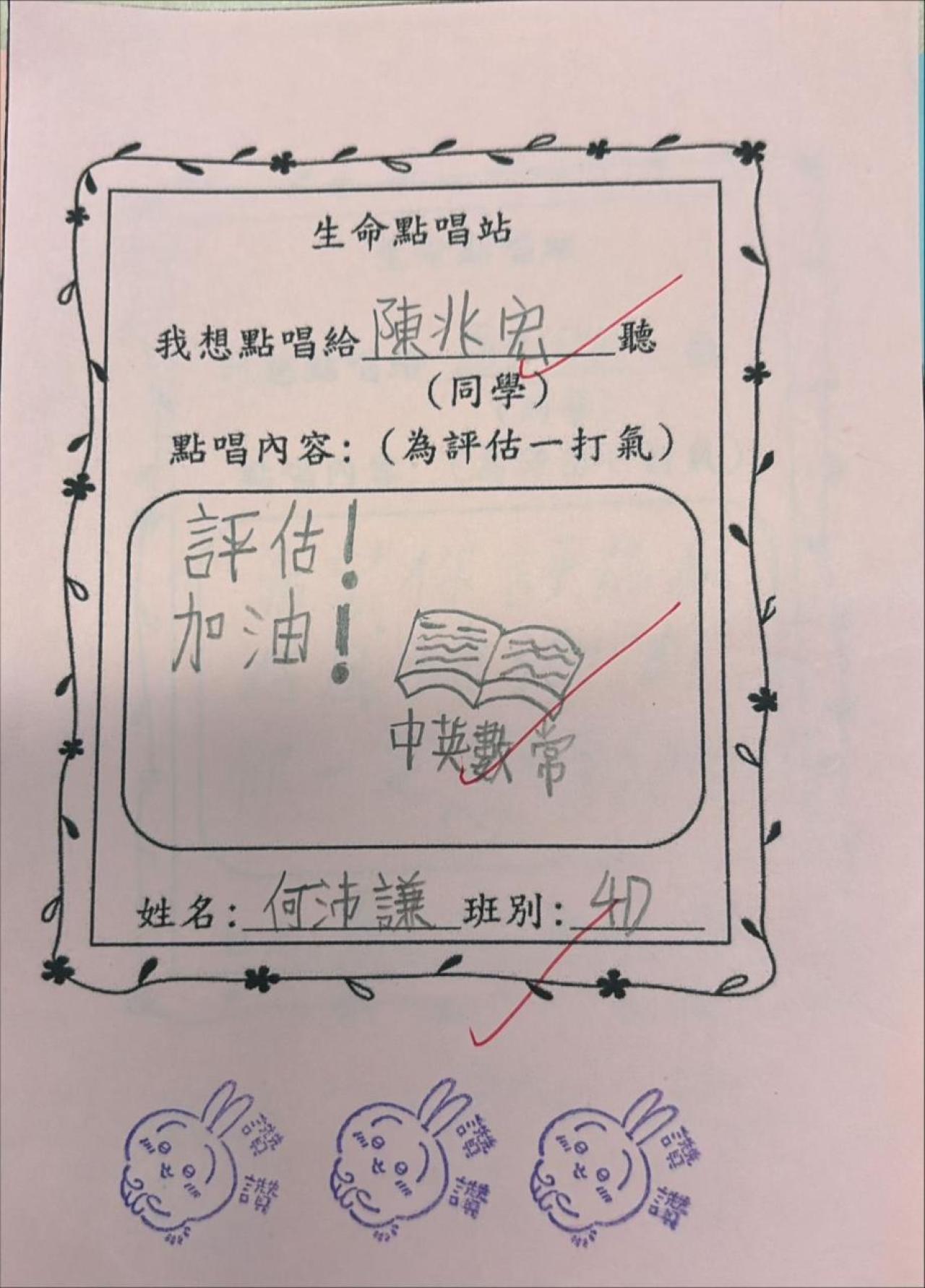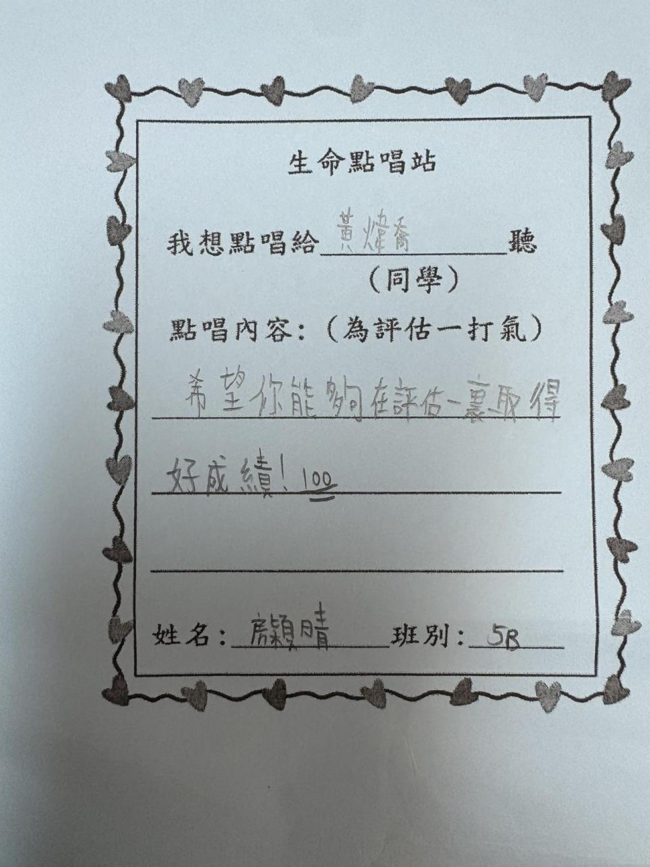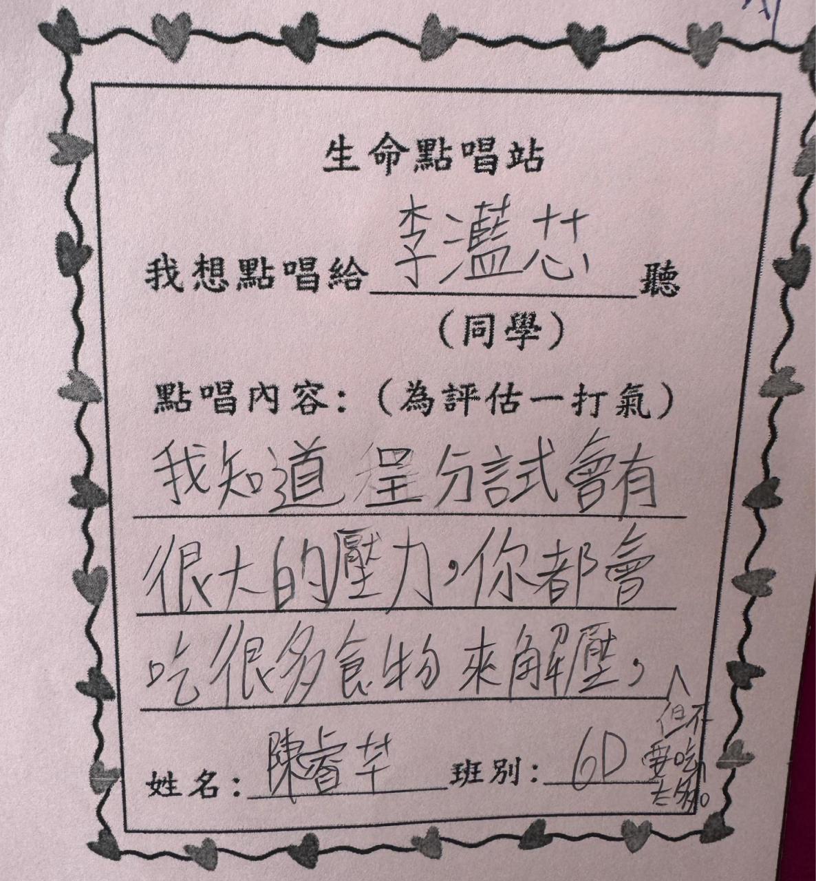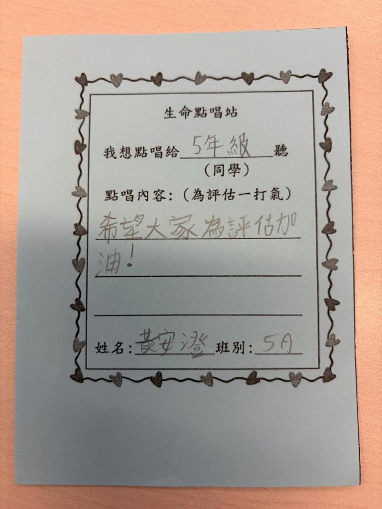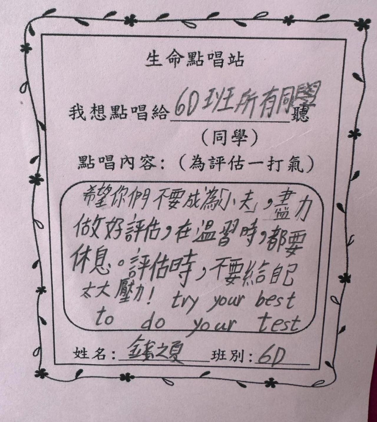 同學透過生命教育科活動「生命點唱站」,以誠意滿滿的點唱紙和勵志歌曲互相打氣,營造出正向氛圍,鼓勵大家以積極的心態面對評估。
