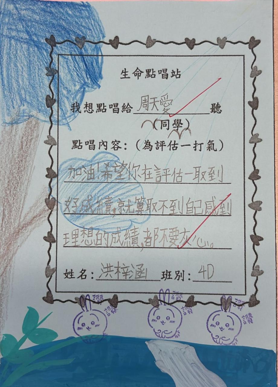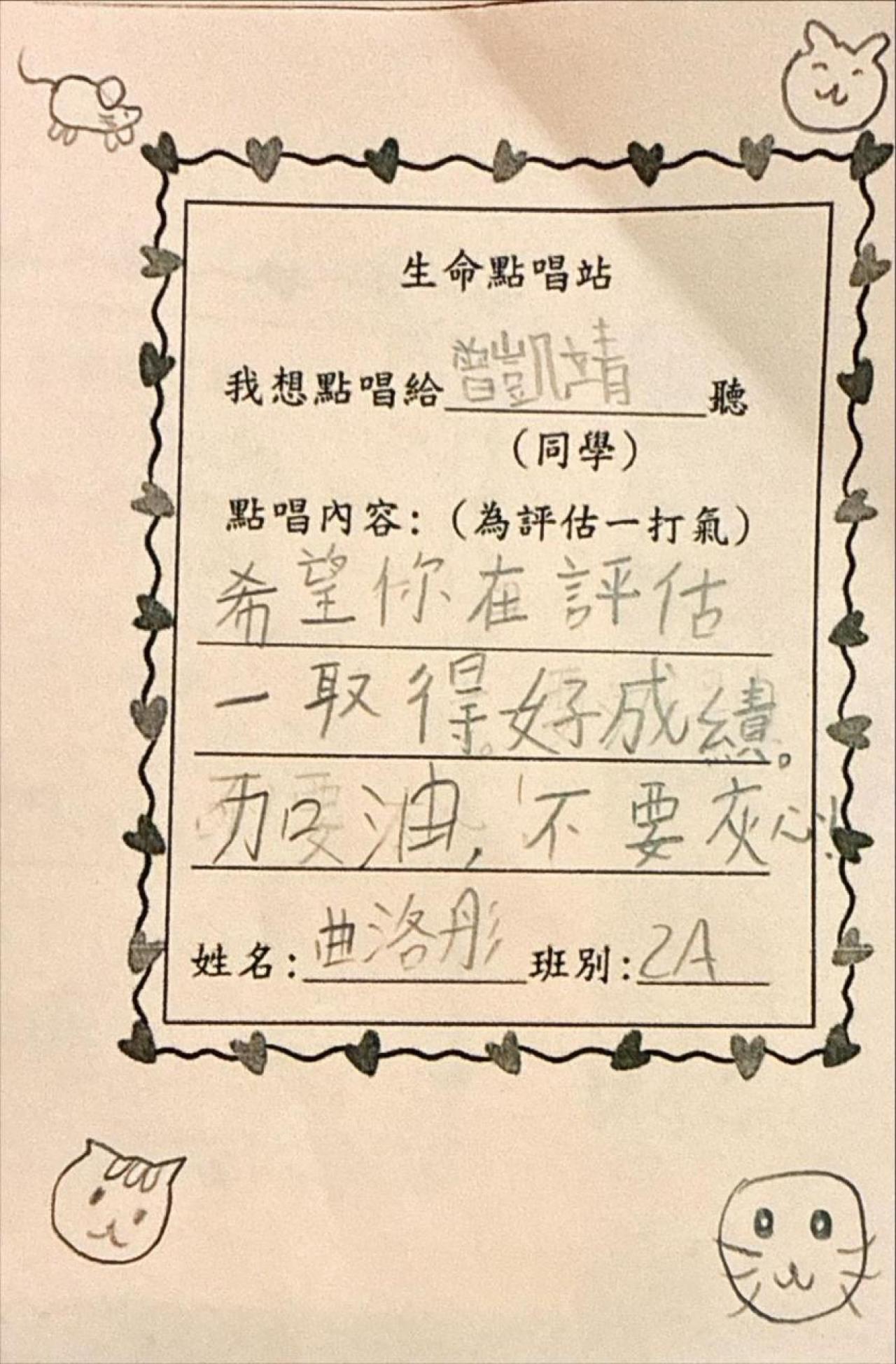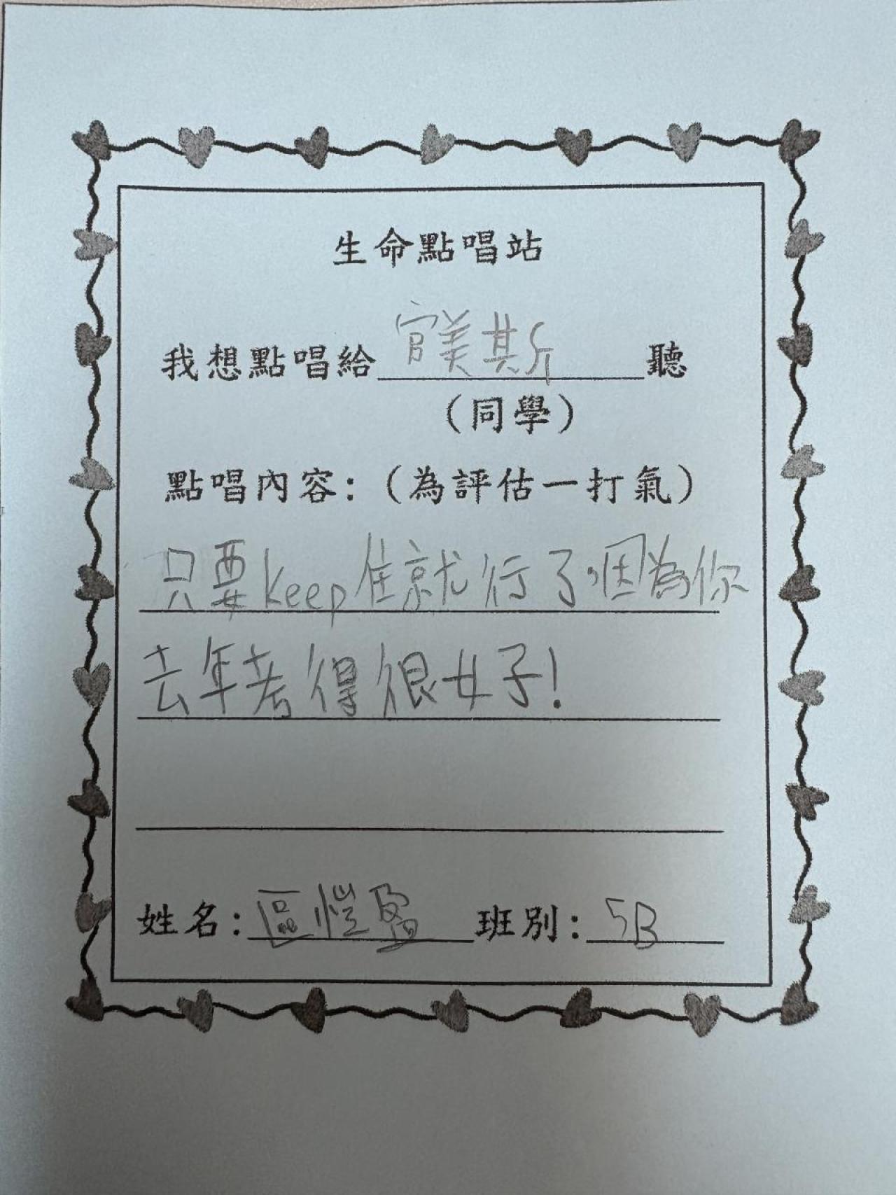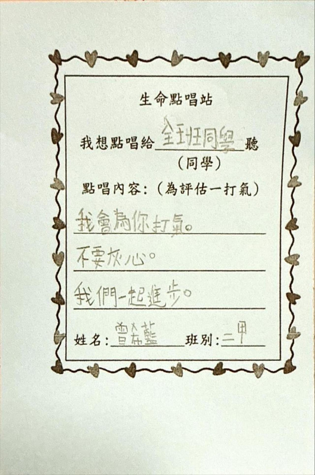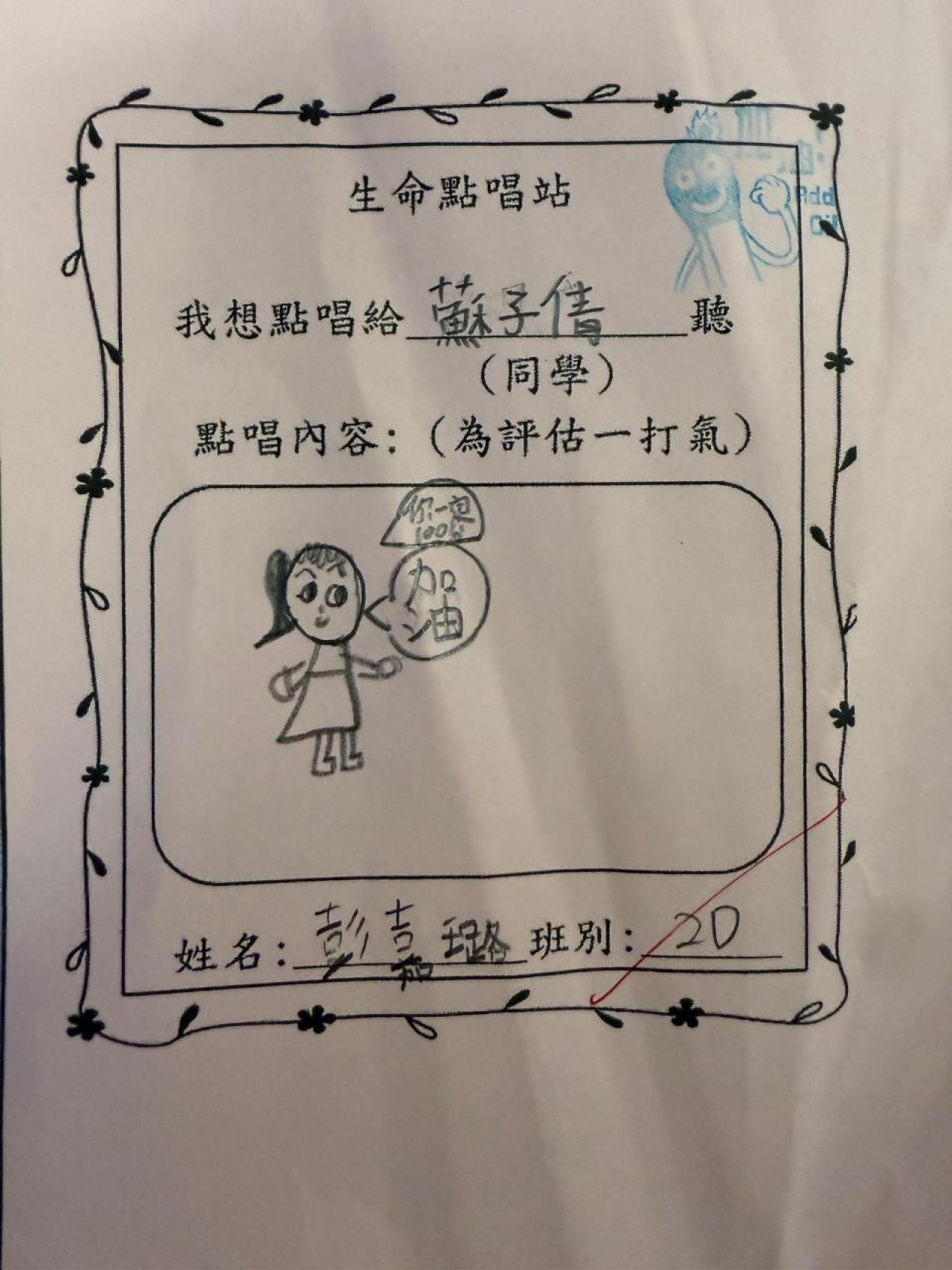 同學透過生命教育科活動「生命點唱站」,以誠意滿滿的點唱紙和勵志歌曲互相打氣,營造出正向氛圍,鼓勵大家以積極的心態面對評估。